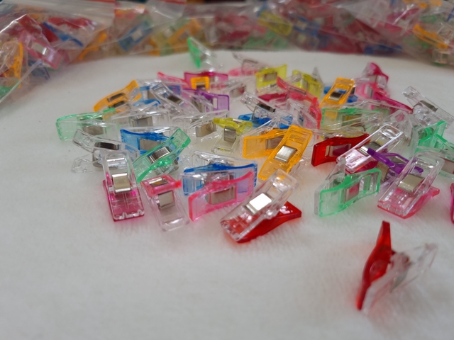 Lot de 50 pinces de couture multicolores. Elles vous permettront de maintenir vos tissus lors de vos travaux de couture. Elles remplaceront sans problème les habituelles épingles. Taille : 27 x 10 mm.